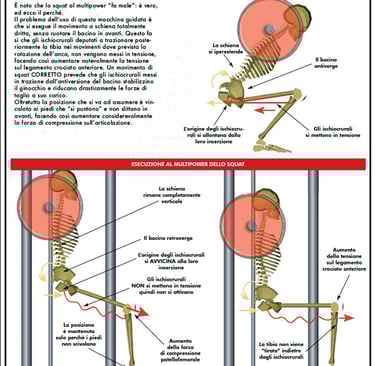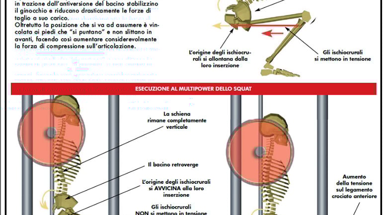 È noto che lo squat al multipower “possa far male”: ed ecco il perché. Il problema principale delle macchine guidate è che spesso portano a eseguire il movimento con la schiena troppo verticale e senza una corretta rotazione del bacino in avanti,Questo fa sì che gli ischiocrurali , deputati a trazionare posteriormente la tibia nei movimenti in cui è prevista la rotazione dell'anca, non vengono messi in tensione, aumentando così in modo significativo la sollecitazione sul legamento crociato anteriore . Uno squat eseguito prevede invece che gli ischiocrurali, messi in trazione dall' antiversione del bacino , stabilizzano il ginocchio e riducono drasticamente le forze di taglio a suo carico. Inoltre, la posizione risulta vincolata: i piedi restano “puntati” e non possono scivolare in avanti, con un conseguente aumento della forza di compressione sull'articolazione.